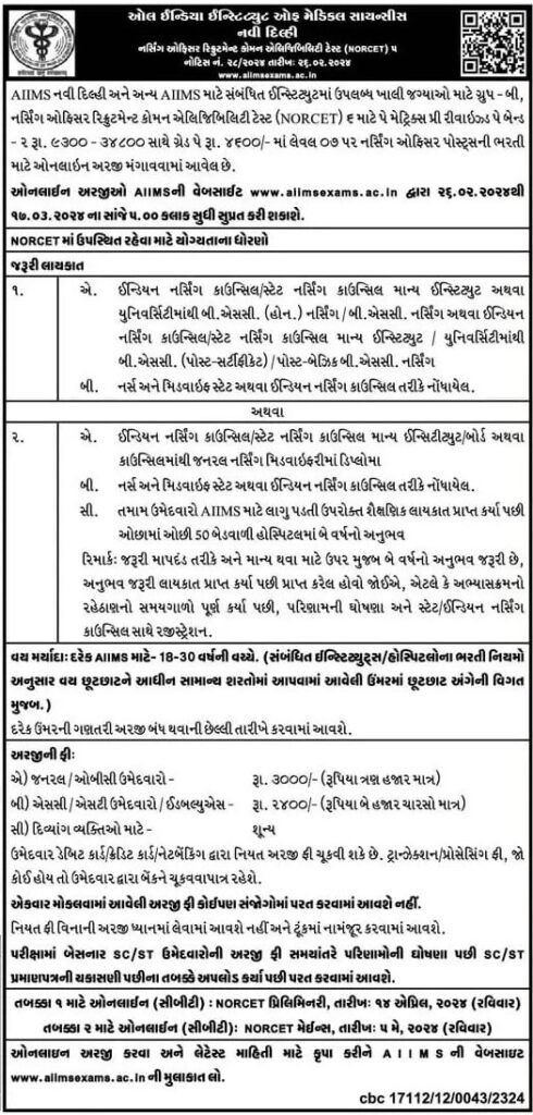 AIIMS NORCET Recruitment 2024 : એઇમ્સ નવીદિલ્હી દ્વારા એઇમ્સ નવીદિલ્હી અને અન્ય એઇમ્સ માટે સંબંધિત ઇન્સ્ટિટ્યુટમાં ઉપલબ્ધ ખાલી જગ્યાઓ માટે ગૃપ-બી નર્સીંગ ઓફિસર રિક્રૂટમેન્ટ કોમન એલિજિબિલિટી ટેસ્ટ ૬ માટે નર્સિંગ ઓફીસરની જગ્યાએ ભરતી કરવા માટે તા. ૧-૩-ર૦ર૪ ના દિવ્ય ભાસ્કર વર્તમાન પત્રમાં તથા એઇમ્સ નવી દિલ્હીની વેબસાઇટ પર જાહેરાત પ્રસિદ્ધ કરી ઓનલાઇન અરજીઓ મંગાવેલ છે. ઓનલાઇન અરજી કરતાં પહેલાં કાળજીપૂર્વક જાહેરાત વાંચવી.