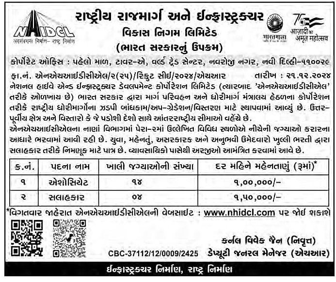 NHIDCL Recruitment 2024 Various Post ભારત સરકારના માર્ગ અને પરીવહન મંત્રાલય હેઠળના રાષ્ટ્રીય રાજમાર્ગ અને ઇન્ફ્રાસ્ટ્રકચર વિકાસ નિગમ લિ., એ ભારત સરકારના નિયંત્રણ હેઠળની કંપની છે, જે દેેેેશના તથા આંતર રાષ્ટ્રીય સરહદો પરના રસ્તાઓનું સંચાલન, જાળવણી અને મરામતનું કામ કરે છે. કંપનીના ડેપ્યુટી જનરલ મેનેજર (એચઆર) એ તા. 21-12-2024 ના રોજ વર્તમાનપત્રમાં તથા વેબસાઇટ પર જાહેરાત પ્રસિદ્ધ કરી એશોસિયેટ અને સલાહકારની જગ્યાઓ કરાર આધારીત ભરતી કરવા અરજીઓ મંગાવીને યુવાન, મહેનતુ, અસરકારક અને અનુભવી ઉમેદવારોને એક ઉત્તમ તક આપેલ છે.