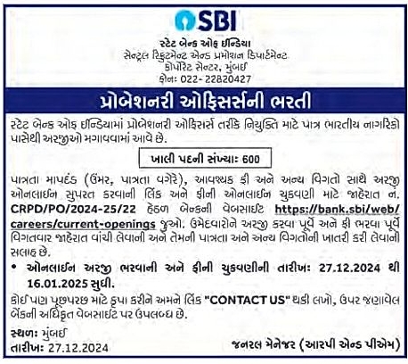 SBI PO Bharati 2025 સ્ટેટ બેન્ક ઓફ ઇન્ડીયાની Probationary Officersની ભરતી માટેના આ શૈક્ષણિક લેખમાં આપણે જગ્યાનો ઓવરવ્યૂ, શૈક્ષણિક લાયકાત, અનુભવ, ઉંમર, અરજી ફી, અરજી કેવી રીતે કરવી વિગેરે જોઇશું. ઓનલાઇન અરજી કરતાં પહેલાં વિગતવાર જાહેરાત કે જેની લીન્ક નીચે આપેલ છે તે કાળજીપૂર્વક વાંચવી.