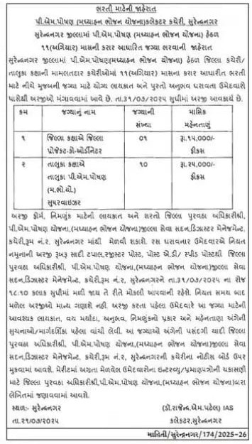 નોંધ: ઉમેદવારોને સલાહ આપવામાં આવે છે કે તેઓ અરજી કરતા પહેલા સંપૂર્ણ વિગતો અને લાયકાતના ચોક્કસ માપદંડો માટે સુરેન્દ્રનગર કલેક્ટર કચેરીનો સંપર્ક કરે.