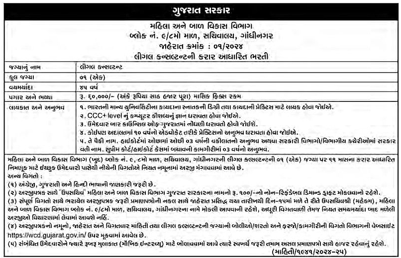 WCD Legal Consultant Recruitment 2025 મહિલા અને બાળ વિકાસ વિભાગ, સચિવાલય, ગાંંધીનગરે તા. 8 Jan 2025 ના રોજ દૈનિક વર્તમાનપત્ર સંદેશમાં સચિવાલય વિભાગ ખાતે લીગલ કન્સલ્ટન્ટની જગ્યા 11 માસના કરાર આધારિત ભરવા માટે લાયકાત ધરાવતા ઇચ્છુક ઉમેદવારો પાસેથી જાહેરાત પ્રસિદ્ધ થયાના દિન ૧પ માં નિયત નમૂનામાં અરજી મંગાવીને નોકરીવાંચ્છુઓને આનંદના સમાચાર આપેલ છે.